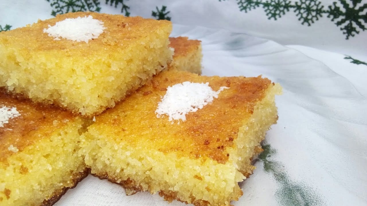 وصفة بسبوسة جوز الهند السهلة مع شام الأصيل وهي تشبه كثيراً الهريسة لكن يضاف إليها البيض وجوز الهند .